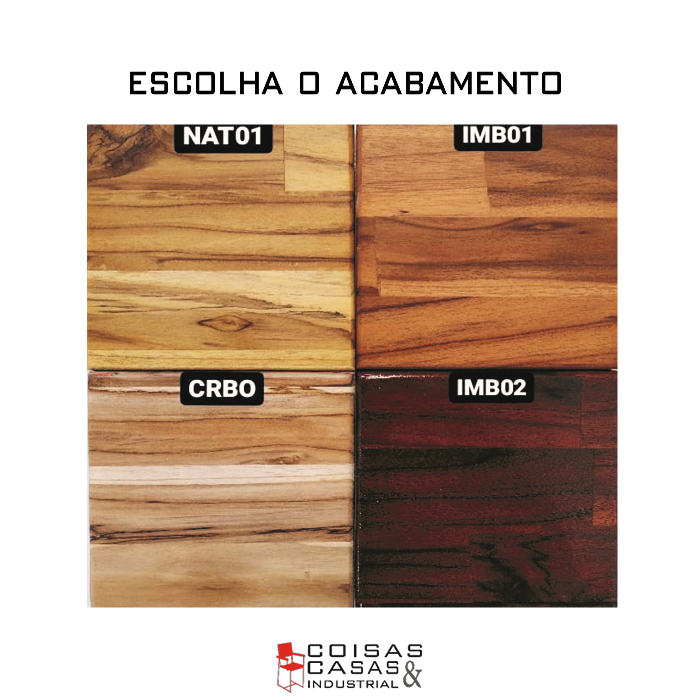 - Madeira Teca maciça: resistente e durável, com acabamento natural que valoriza os veios e a textura da madeira.